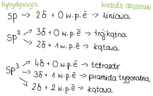 Aby wyznaczyć hybrydyzację atomu w najprostszy sposób, należy policzyć liczbę wiązań sigma, które odchodzą od tego atomu i dodać do niej liczbę wolnych par elektronowych zlokalizowanych na tym atomie. Jeśli suma ta wynosi 2, mamy do czynienia z hybrydyzacją sp, jeśli 3- sp2, a 4- sp3.
