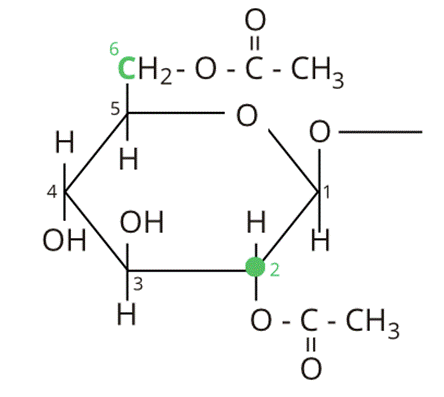 Najpierw zaznacz drugi i szósty atom węgla. Estry to związki powstałe w reakcji alkoholu i kwasu karboksylowego. Równanie reakcji zachodzi wedługschematu: R1COOH + R2OH → R1COOR2 + H2O, gdzie -R1 i -R2 oznaczają odpowiednie reszty węglowodorowe. Celulozę traktujemy tutaj jak alkohol (wodór z grupy –OH ulega odszczepieniu). Kwas octowy ma wzór CH3COOH i odszczepieniu ulega grupa -OH. Wiązanie estrowe tworzy się pomiędzy grupą pochodzącą od kwasu a wodorem grupy hydroksylowej alkoholu.