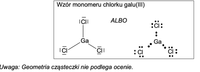 Przedstaw wzór elektronowy monomeru chlorku galu (III), w którym wiążące i wolne pary elektronowe zaznaczysz kreskami.