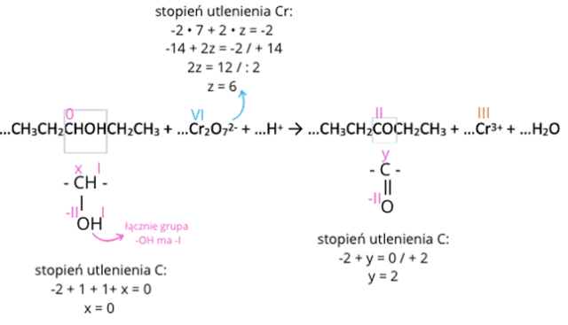 Krok 1: Zwróć uwagę na stopnie utlenienia atomów pierwiastków. Ładunek związku wynosi 0, o ile nie są zaznaczone jony. Jeśli są – ładunek jest im równy. Tlen ma wartościowość -II, wodór I. Obliczamy wartościowość tych atomów, które uległy zmianie (chrom i węgiel).