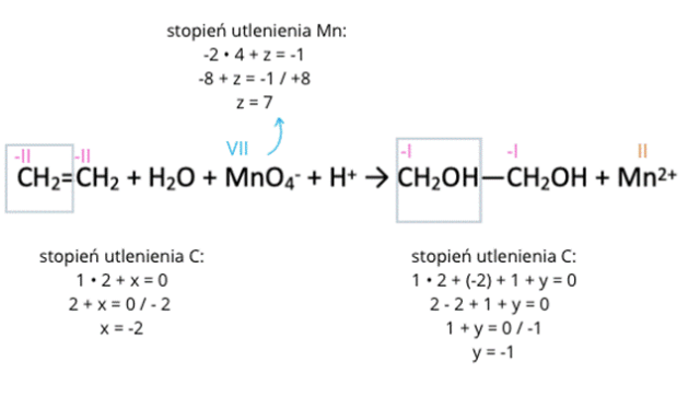 Krok 1: Zwróć uwagę na stopnie utlenienia atomów pierwiastków. Ładunek związku wynosi 0, o ile nie są zaznaczone jony. Jeśli są – ładunek jest im równy. Tlen ma wartościowość -II, wodór I. Obliczamy wartościowość tych atomów, które uległy zmianie (mangan i węgiel).