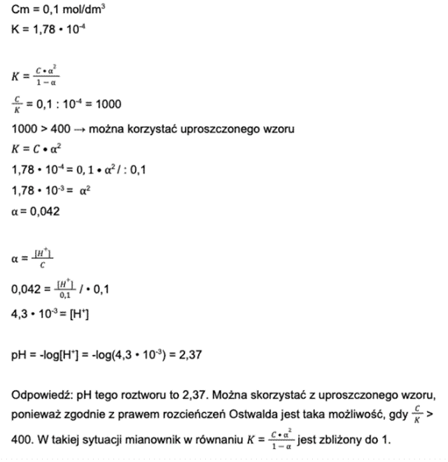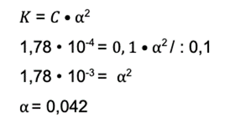 Krok 3: Mamy dostępną wartość stopnia dysocjacji i stężenie. Wracamy do początku punktu drugiego i rozwiązujemy równanie: