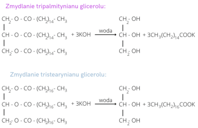 W pierwszym kroku zapisz wzór tripalmitynianu glicerolu. Jest to tłuszcz zbudowany z glicerolu i kwasu palmitynowego. Hydroliza w środowisku zasadowym (zmydlanie) pozwala na uzyskanie glicerolu i mydła, czyli soli kwasu tłuszczowego.