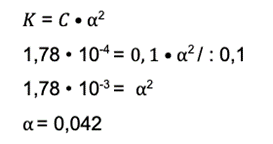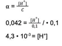 Krok 3: Mamy dostępną wartość stopnia dysocjacji i stężenie. Wracamy do początku punktu drugiego i rozwiązujemy równanie: