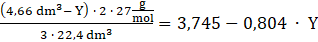 Z równań reakcji widzimy, ile moli danego metalu potrzeba do wytworzenia określonej liczby moli wodoru (1 mol gazu to 22,4 dm3, więc to będziemy podstawiać). Układamy proporcje z dwoma niewiadomymi i wyliczamy równanie na masę glinu wyrażoną pośrednio przez objętość wodoru jaka powstała po reakcji z cynkiem (Y). Odwracamy równanie, aby to objętość H2, jaką wydziela cynk, była szukaną. Układamy drugą proporcję, gdzie masa cynku jest wyrażona jako 10 g minus masa glinu, a objętość wodoru, jaką wydziela cynk, wyrażamy przez poprzednie równanie z niewiadomą X. Powstaje nam równanie z jedną niewiadomą, którą jest masa glinu. Rozwiązujemy równanie, otrzymując masę glinu i z tego miejsca możemy już określić masę cynku, gdyż suma obydwu mas jest równa 10 g.