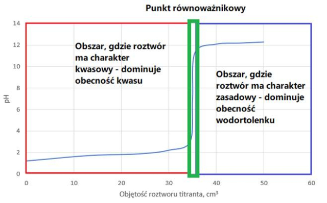 Po dodaniu 45 cm3 titranta, jakim jest wodorotlenek sodu, roztwór jest zasadowy o pH lekko powyżej 12. Oznacza to, że: