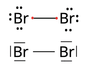 W pierwszym kroku zapisz wzór cząsteczki bromu – Br2. Brom ma siedem elektronów walencyjnych. Do uzyskania oktetu elektronowego brakuje mu jednego elektronu. Elektron ten może zostać uwspólniony pomiędzy atomami bromu, co powoduje powstanie wiązania kowalencyjnego niespolaryzowanego. Elektrony walencyjne, które nie biorą udziału w wiązaniu tworzą pary niewiążące (dwa elektrony to jedna para). Na czerwono zaznaczono elektrony wiążące, a na czarno – niewiążące. Czarne kreski to pary elektronów niewiążących. Jest ich sześć.
