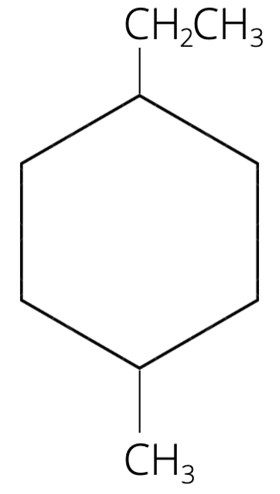 Wzór grupowy (półstrukturalny) to uproszczony wzór strukturalny. Wyszczególniamy w nim wiązania pomiędzy atomami węgla, ale omijamy te między atomami węgla a innymi pierwiastkami. Zgodnie z teorią strukturalną, węgiel tworzy cztery wiązania, wodór – jedno, azot – trzy, a tlen – dwa. W pierwszym kroku zapisz szkielet węglowy związku – cykloheksanu. Następnie zapisz podstawniki – w tym przypadku grupę etylową przy pierwszym atomie węgla i grupę metylową przy czwartym.