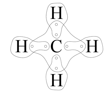 Atom wodoru dąży do uzyskania dubletu elektronowego. Brakuje mu do tego jednego elektronu. Atomowi węgla brakuje czterech elektronów do uzyskania oktetu elektronowego. węgiel brakujące cztery elektrony uwspólnia z czterema atomami wodoru. Mamy cztery wspólne pary elektronowe (cztery wiązania pojedyncze).