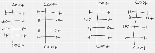 W tym zadaniu musisz narysować wzory wszystkich enancjomerów oraz diastereoizomerów kwasu3,4– dihydroksy–1,6–hexanodiowego w produkcji Fischera. Podaj liczbę enancjomerów tego hydroksykwasu.