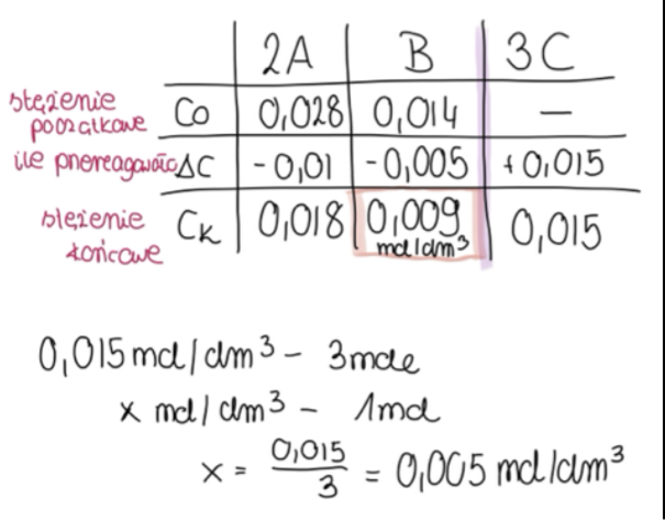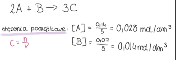 Wyznacz stężenie substancji B w reaktorze w momencie, gdy ilość powstałego produktu C osiągnęła 0,015 mola.