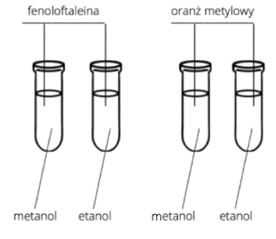 Najpierw przypomnij sobie jakie barwy przybierają podane wskaźniki kwasowo-zasadowe w zależności od pH. Następnie, znając pH alkoholi (obojętne), określ barwy wskaźników w tym przypadku. Napisz obserwacje i wnioski.