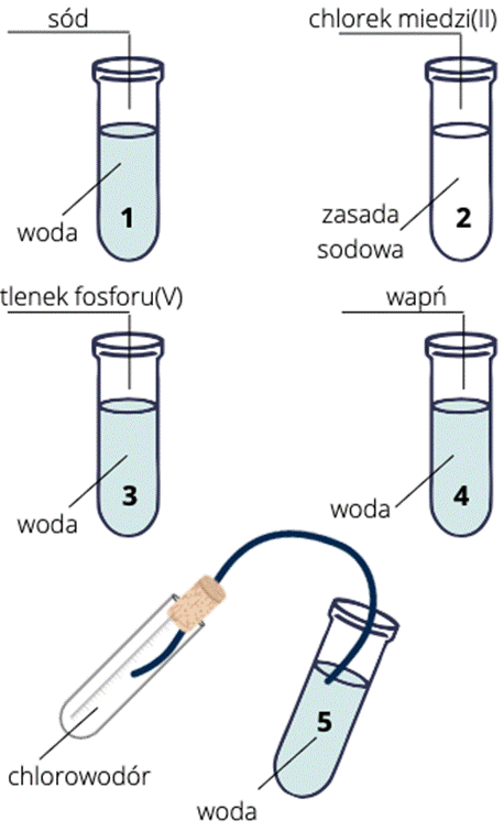 Odczynniki: woda, zasada sodowa, sód, wapń, tlenek fosforu(V), chlorowodór, chlorek miedzi(II).