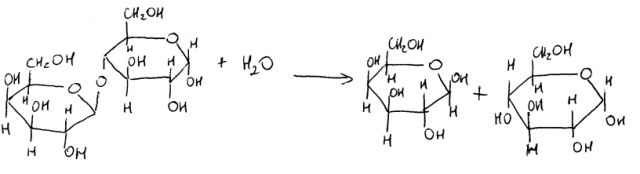 Jedna cząsteczka laktozy reaguje z jedną cząsteczką wody. W wyniku reakcji powstaje jedna cząsteczka glukozy i jedna cząsteczka galaktozy.