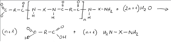 Zapisz ogólną reakcję hydrolizy poliamidów. Wskaż wiązanie ulegające zerwaniu.