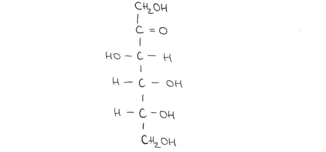 Projekcja Fischera pozwala na zapis łańcuchowy związku. Wszystkie atomy węgla umieszczamy w pionowym łańcuchu, a podstawniki – w łańcuchach poziomych. Grupy hydroksylowe fruktozy przy węglach 3 i 4 zajmują miejsca po przeciwnych stronach krzyża. Grupa karbonylowa (-CO) świadczy o przynależności związku do ketonów. Mnogość grup -OH pozwala zaliczyć fruktozę do polihydroksyketonów.