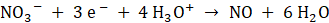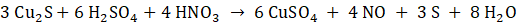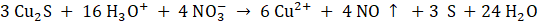 Aby wykonać bilans elektronowo-jonowy, najpierw zapisujemy równania połówkowe, wstawiając tylko niezbędne komponenty. Następnie bilansujemy atomy tlenu i wodoru, dodając H2O, OH- lub H3O+ w zależności od potrzeb, pamiętając o środowisku, w jakim zachodzi cała reakcja. Uwzględniamy liczbę elektronów, tak aby całościowy ładunek reakcji był taki sam po lewej i prawej stronie. Mnożymy procesy połówkowe, aby liczba elektronów oddawanych i przyjmowanych w obrębie całej reakcji była taka sama. Dodajemy obie reakcje połówkowe do siebie i wykreślamy rzeczy znajdujące się po jednej, jak i po drugiej stronie. Na koniec sprowadzamy równanie do najniższej wartości współczynników stechiometrycznych. Analizując sumaryczne równanie, widzimy, że jony oksoniowe są po stronie substratów w nadmiarze, więc w równaniu cząsteczkowym będziemy potrzebowali kwasu (którego reszta kwasowa zostanie wykreślona z równania jonowego po jednej i po drugiej stronie przez wzgląd, że łączy się on z jonami Cu2+). Związek ten musi również dysocjować, a z tablicy rozpuszczalności odczytujemy, że np. CuSO4 jest rozpuszczalny w wodzie. Kwas siarkowy(VI) będzie więc naszym reagentem.