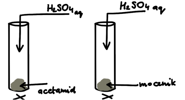 W tym zadaniu należy zaproponować doświadczenie, wraz z opisem obserwacji, wniosków, rysunkiem oraz równaniami reakcji, dotyczące sposobu rozróżnienia acetamidu od mocznika.