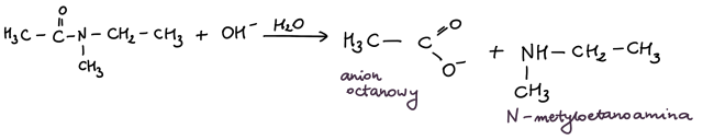 W tym zadaniu należy podać równanie reakcji hydrolizy powyższego amidu w środowisku zasadowym i nazwać produkty tej reakcji.
