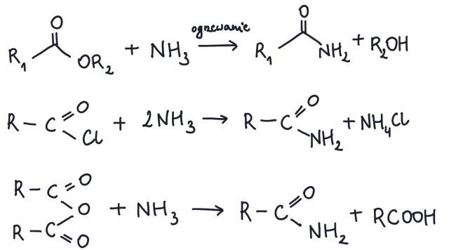 Istnieją trzy główne sposoby otrzymywania amidów. Pierwsza metoda polega na działaniu amoniakiem na kwasy karboksylowe, czyli chlorki, bezwodniki kwasowe oraz estry). Druga metoda charakteryzuje się odwodnieniem soli amonowych kwasów karboksylowych. Natomiast trzecia to zwyczajnie hydroliza nitryli.