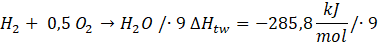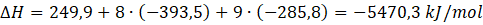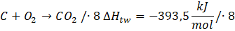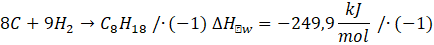 Zapisz reakcje tworzenia. Następnie pomnóż pierwsze równanie przez -1, aby odwrócić równanie (wtedy też musisz pomnożyć przez -1 entalpię), drugie pomnóż przez 8, aby dostać odpowiednie ilości związków, trzecie pomnóż przez 9, by dostać odpowiednie ilości związków: