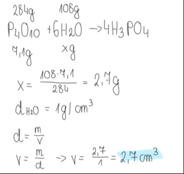 Oblicz objętość wody, jaka jest potrzebna do zajścia reakcji, w której wyniku z 7,1 g P4O10 powstanie H3PO4.