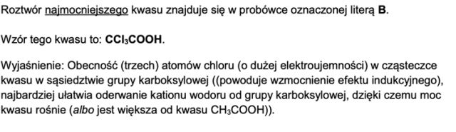 Zapoznaj się z informacjami zawartymi w treści zadania, a następnie wybierz probówkę, w której znajduje się roztwór najmocniejszego kwasu i dokończ zdania. Dodatkowo wytłumacz, dlaczego wybrany kwas wykazuje największą moc, odnosząc się do budowy cząsteczek tego związku.