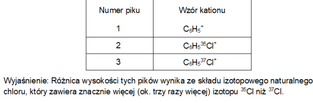Uzupełnij tabelę, wpisując wzory sumaryczne kationów odpowiadających kolejnym pikom. Jeśli w jonie występuje chlor, podaj jego liczbę masową. Dodatkowo wyjaśnij, dlaczego dwa piki molekularne znacznie różnią się pod względem wysokości.