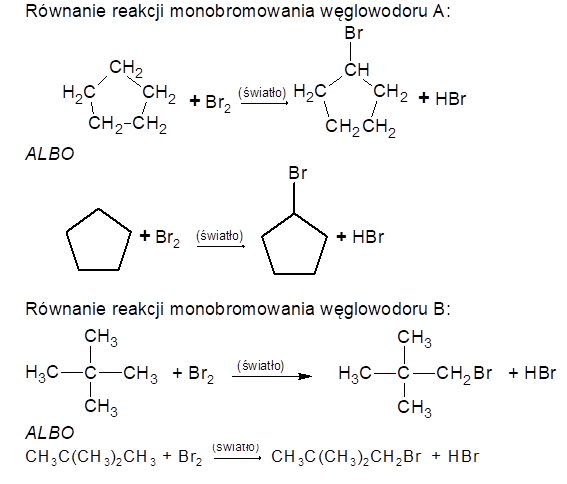 Zapisz równania reakcji monobromowania węglowodorów A i B, stosując wzory półstrukturalne związków organicznych.