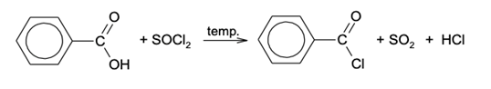 Zapisz równanie reakcji otrzymywania chlorku benzoilu metodą opisaną w treści zadania, stosując wzory grupowe bądź uproszczone odpowiedniego kwasu karboksylowego.