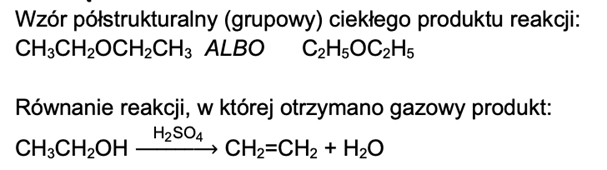 Zapisz wzór półstrukturalny (grupowy) ciekłego produktu reakcji oraz równanie reakcji, w której wyniku otrzymano gazowy produkt, stosując w nim wzory półstrukturalne (grupowe) związków organicznych.