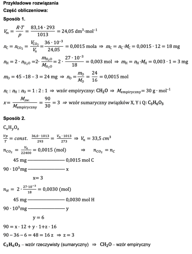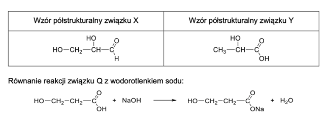 Dokonaj odpowiednich obliczeń, a następnie ustal wzór elementarny i rzeczywisty (sumaryczny) opisanych związków. W koljnym etapie zapisz wzory półstrukturalne (grupowe) związków X i Y w formie cząsteczkowej oraz równanie reakcji związku Q z wodorotlenkiem sodu, stosując wzory półstrukturalne związków organicznych.
