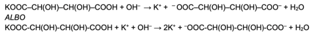 W formie jonowej zapisz równanie reakcji zachodzącej podczas roztwarzania wodorowinianu potasu w wodnym roztworze wodorotlenku potasu. Zastosuj wzory półstrukturalne związków organicznych.