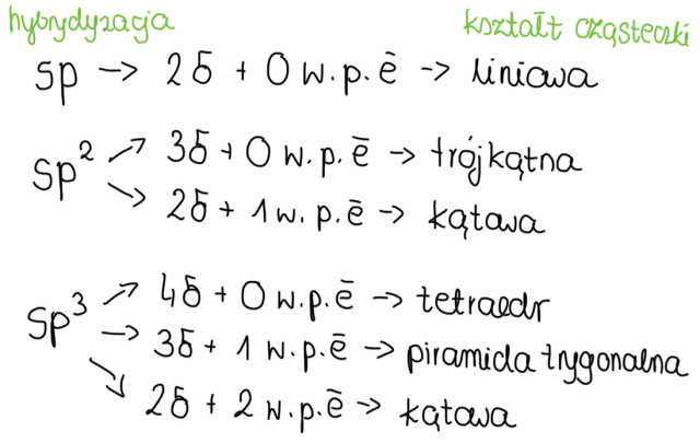 Aby wyznaczyć hybrydyzację atomu w najprostszy sposób, należy policzyć liczbę wiązań sigma, które odchodzą od tego atomu i dodać do niej liczbę wolnych par elektronowych zlokalizowanych na tym atomie. Jeśli suma ta wynosi 2, mamy do czynienia z hybrydyzacją sp, jeśli 3- sp2, 4- sp3, 5- sp3d.