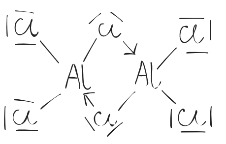 We wzorze kreskowym wiążące pary elektronowe, wolne pary elektronowe oznacza się kreskami, a wiązania koordynacyjne – strzałkami. Glinowi brakuje całej pary elektronów, natomiast chlor posiada wolne pary elektronowe. Dwa różne atomy chloru uwspólniają całą parę z dwoma różnymi atomami glinu.