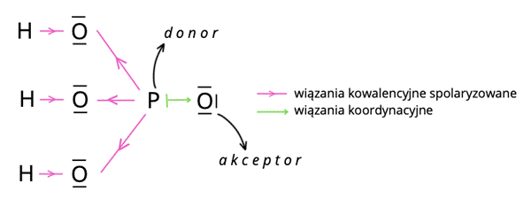 Wiązanie koordynacyjne to takie, w którym para elektronów wiązaniu pochodzi od tylko jednego atomu. Dawca pary to donor (tu: fosfor), a biorca to akceptor (tu: tlen). Donor musi mieć utworzoną trwałą konfigurację elektronową i dodatkową wolną parę elektronów, by przekazać ją akceptorowi.
