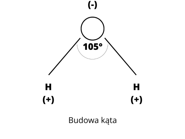 Narysuj cząsteczkę wody, uwzględnij fakt, że kąt między wiązaniami O-H w cząsteczce wody wynosi 105°.