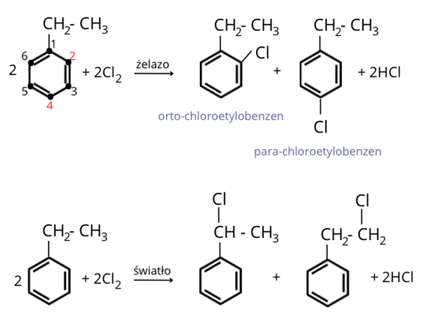 Zwróć uwagę na warunki reakcji. Użycie katalizatora (tu: żelaza) umożliwia wymianę atomu wodoru w pierścieniu benzenu. Reakcja zachodzi zgodnie z mechanizmem substytucji elektrofilowej. Podstawniki są kierowane w pozycję orto- i para-, co oznacza, że homolog benzenu posiada podstawnik I rodzaju. Takim podstawnikiem jest grupa etylowa.
