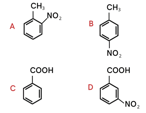 Benzoesan potasu w reakcji z mocniejszym kwasem (HCl) daje kwas benzoesowy (C) i sól – chlorek potasu. Kwas benzoesowy ulega nitrowaniu dając kwas meta-nitrobenzoesowy. Grupa karboksylowa również jest podstawnikiem II rodzaju.