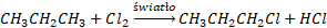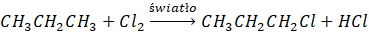 Alkan w reakcji z fluorowcem pod wpływem światła daje fluorowcopochodną i fluorowcowodór w reakcji substytucji (powstają dwa produkty).