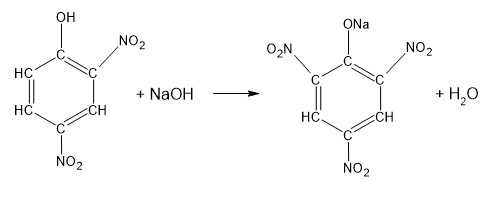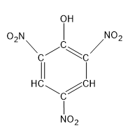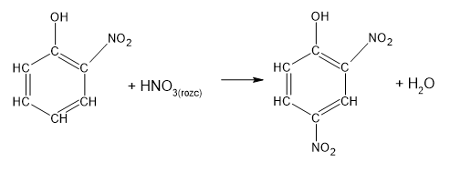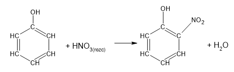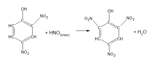 Etapowa reakcja z rozcieńczonym kwasem azotowym(V) powoduje podstawianie w kolejne pozycje pierścienia grup nitrowych. Na początku fenol podstawia się w pozycję orto, później – para, a później w kolejną pozycję orto.