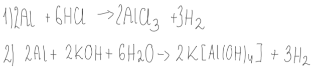 Zapisz w formie jonowej skróconej równania reakcji pierwiastka X: – z kwasem solnym (reakcja 1.) oraz – ze stężonym roztworem wodorotlenku potasu (reakcja 2.), wiedzą, że w drugiej z nich powstaje jon kompleksowy o liczbie koordynacji równej 4.