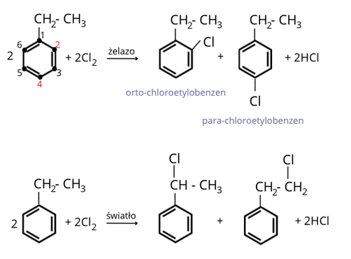 Zwróć uwagę na warunki reakcji. Użycie katalizatora (tu: żelaza) umożliwia wymianę atomu wodoru w pierścieniu benzenu. Reakcja zachodzi zgodnie z mechanizmem substytucji elektrofilowej. Podstawniki są kierowane w pozycję orto- i para-, co oznacza, że homolog benzenu posiada podstawnik I rodzaju. Takim podstawnikiem jest grupa etylowa.