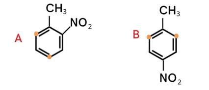 Grupa nitrowa to podstawnik II rodzaju, co oznacza, że kieruje podstawniki w pozycje meta- (3). Orto-nitrotoluen w reakcji nitrowania daje dwie pochodne, a para-nitrotoluen jedną. Oznacza to, że związek A to para-nitrotoluen, a związek B to orto-nitrotoluen. Kropkami zaznaczono miejsca przyłączania kolejnych grup nitrowych – zwróć uwagę, że obie kropki pomarańczowe przy związku B to ten sam efekt: