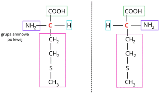 Krok 3: Odnalezienie L-metioniny. L-aminokwasy to te, które mają w projekcji Fishera po lewej stronie grupę aminową.