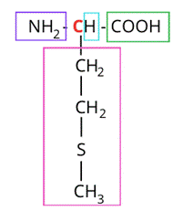Krok 2: Zastanów się, co decyduje o tym, czy związek jest optycznie czynny. Warunkiem istnienia enancjomerów jest obecność chiralnego atomu węgla, czyli atomu węgla z czterema różnymi podstawnikami. Metionina ma taki atom węgla (zaznaczony na czerwono). Podstawniki zaznaczono w ramki.