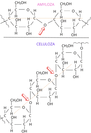 Na rysunku zaznaczono wiązania w amylozie i celulozie (czerwone strzałki). Już na rysunku widać, że zarówno łańcuch amylozy, jak i celulozy, jest nierozgałęziony - prowadzony jest liniowo. Na pomarańczowo zaznaczono liniowość.
