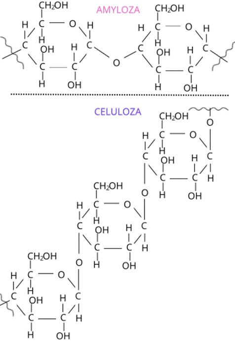 Amyloza to cząsteczka o nierozgałęzionym łańcuchu, którego monomery, cząsteczki alfa-glukozy, połączone są wiązaniami alfa-1,4-O-glikozydowymi. Amyloza składa się zwykle z 300-4000 fragmentów D-glukozy. Celuloza to polimer, którego cząsteczki mają nawet do 15000 fragmentów D-glukozy. Monomerem celulozy są natomiast cząsteczki beta-glukozy, którełącząsięwiązaniami beta-1,4-O-glikozydowymi.