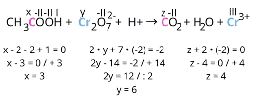 Krok 1: Zwróć uwagę na stopnie utlenienia atomów pierwiastków. Ładunek związku wynosi 0, o ile nie są zaznaczone jony. Jeśli są – ładunek jest im równy. Tlen ma wartościowość –II, wodór I. Obliczamy wartościowość tych atomów, które uległyzmianie (chrom i węgiel).