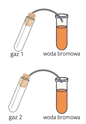 W pierwszym kroku zastanów się, jaka jest budowa obu związków. Następnie pomyśl o właściwościach wody bromowej. Woda bromowa to związek zdolny do wskazywania związków z wiązaniem wielokrotnym. Przyłączanie atomów bromu do wiązania wielokrotnego obserwuje się jako odbarwienie wody bromowej.
